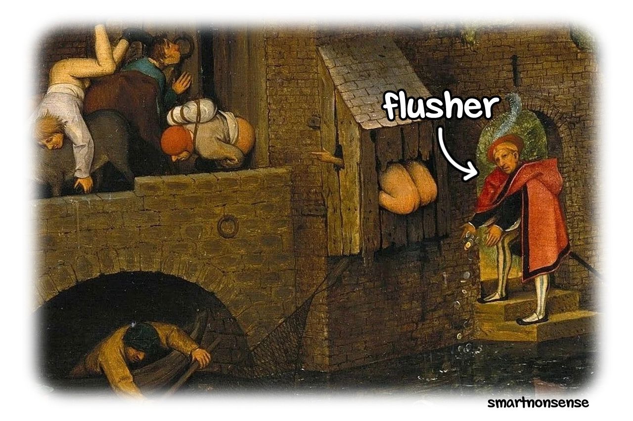 But in 1596, this dude Sir John Harrington invents the FLUSHABLE toilet for Queen Elizabeth